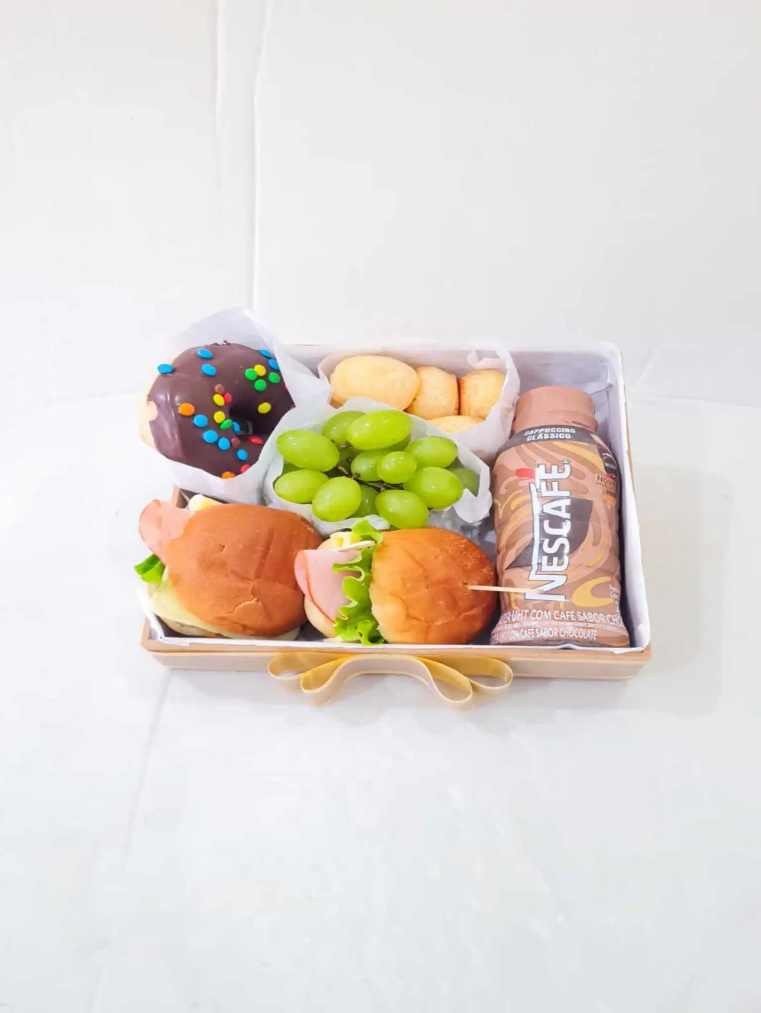 Caixa em MDF decorada, excelente opção para um café da manhã ou chá da tarde individual, embalada em papel celofane transparente com laço de fita decorativo.