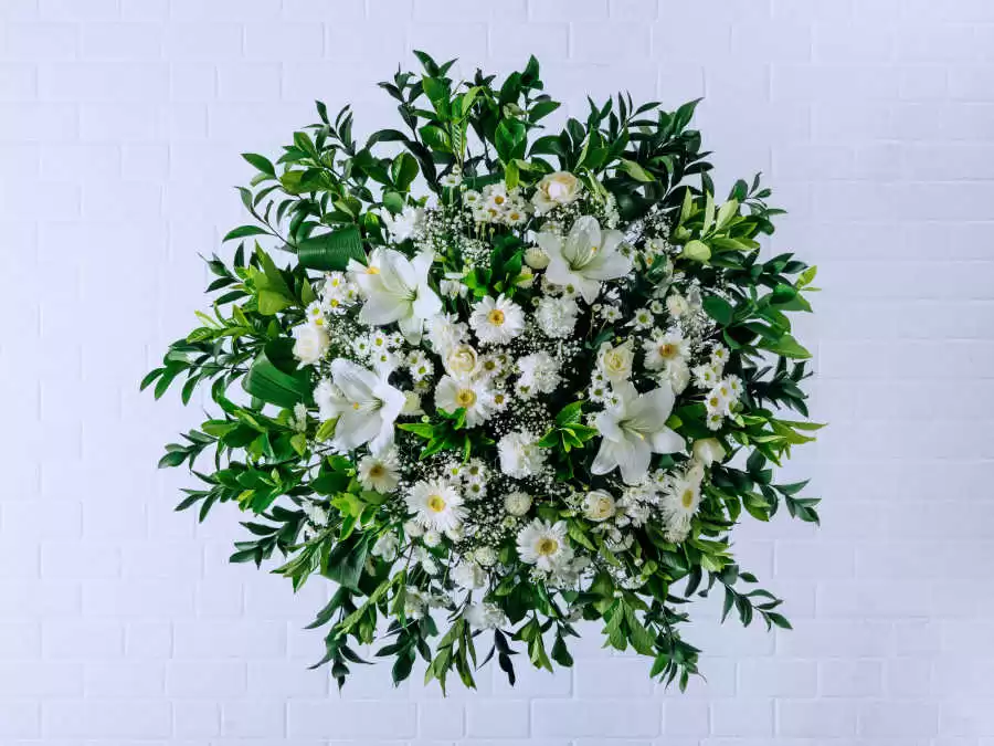 Coroa fúnebre elegante para velório, confeccionada com flores brancas e verdes, 55 cm de diâmetro. As flores poderão variar de acordo com a disponibilidade.